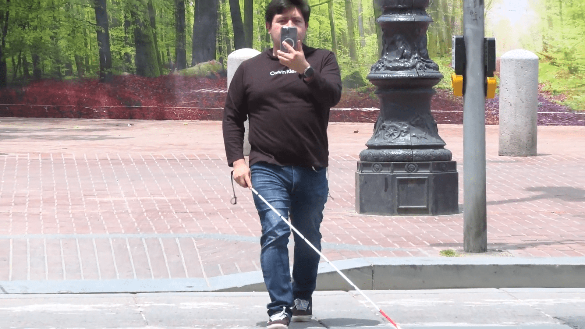 Fernando Macias uses a mobile app to help him cross the street Credit: Nicole Aponte
